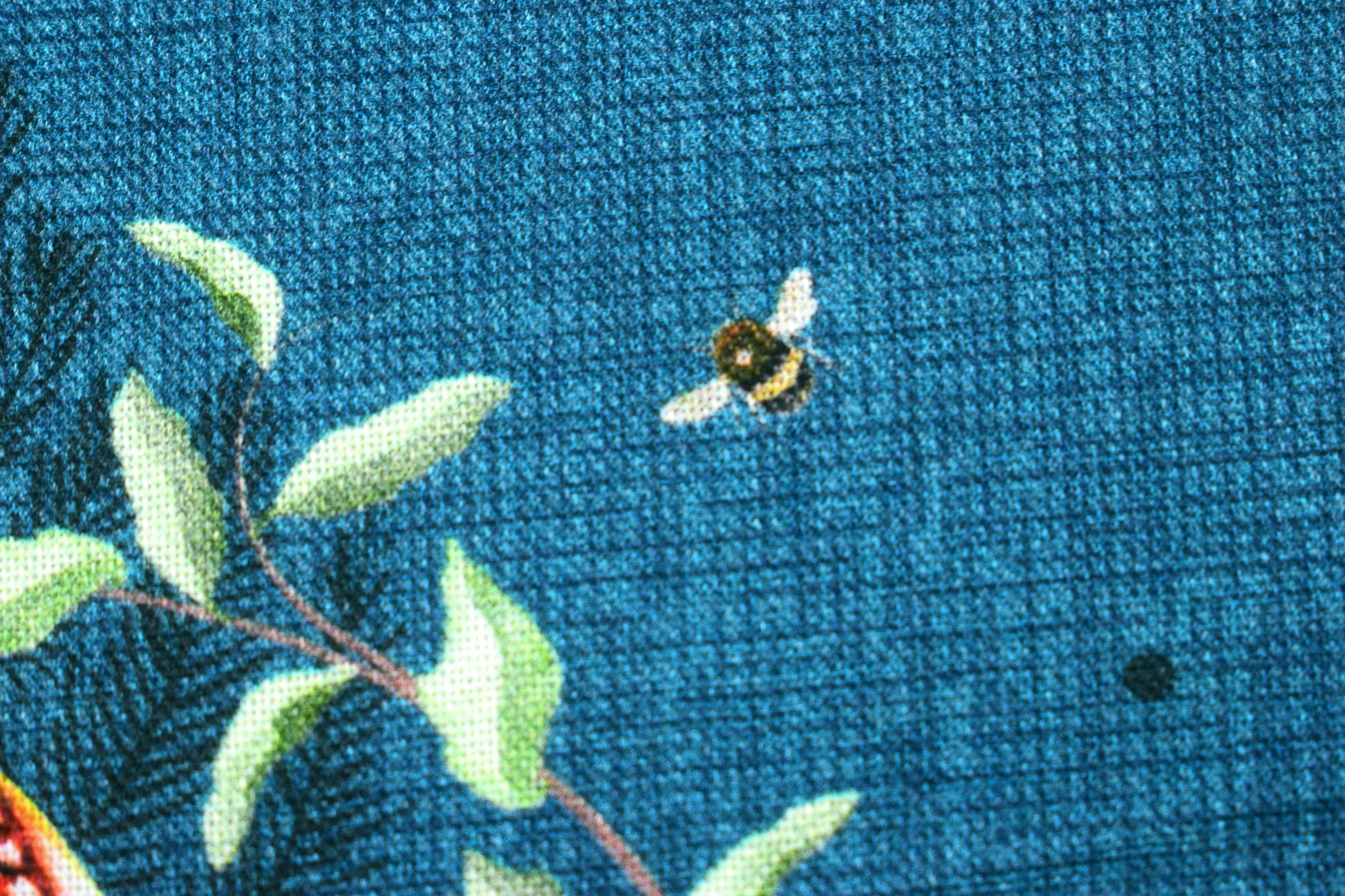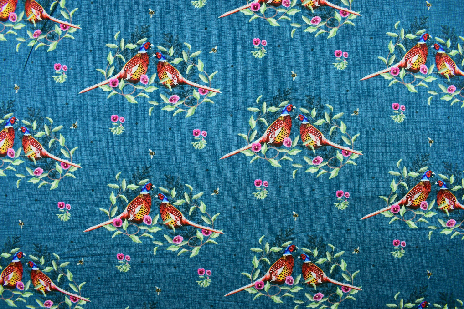 The beautiful design features majestic pheasants nestled within lush botanical wreaths accented by sweet pink pansies and tiny, charming bees, all set against a rich, deep teal blue background. This timeless motif evokes the warmth and sophistication of traditional English country style.