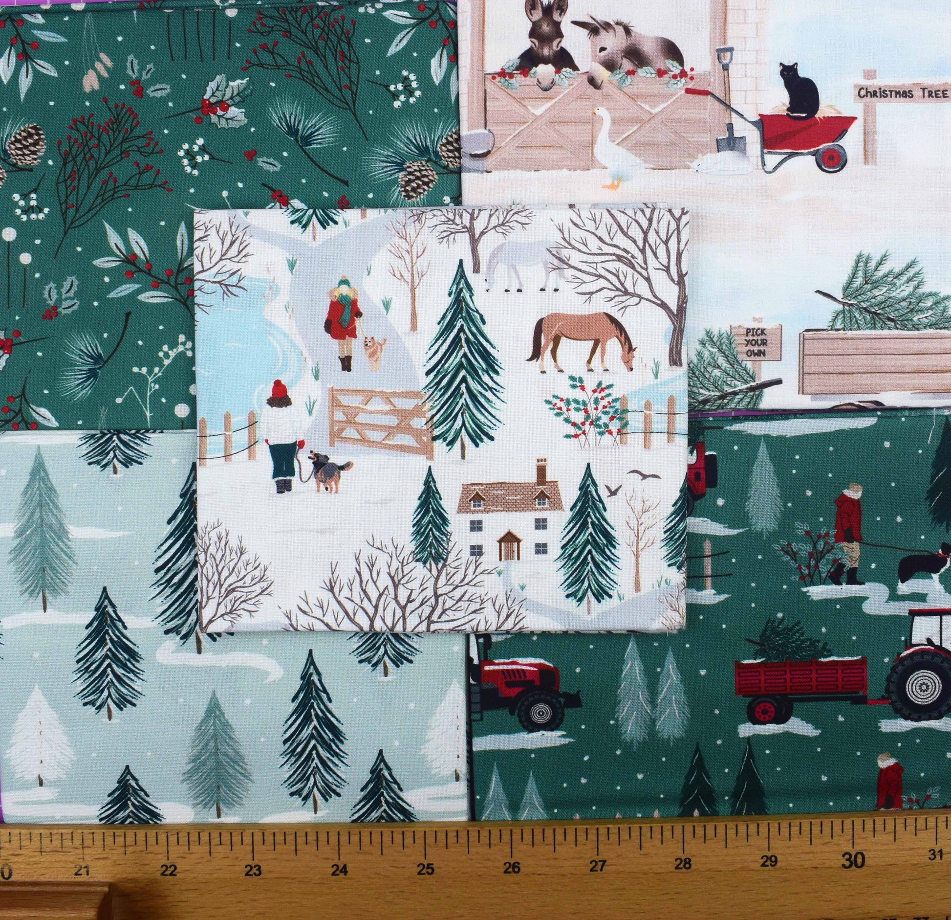 Capture the charm of a country Christmas with this beautiful fat quarter bundle, perfect for festive quilting and sewing projects. This collection features a range of coordinating prints inspired by winter in the countryside – snowy woodland scenes with farmers and border collies, frosty pine branches, peaceful horses and riders, and cosy village landscapes. Soft seasonal colours of icy blue, deep green, midnight navy, and frosty white are accented with warm touches of red and gold for a timeless holiday feel.