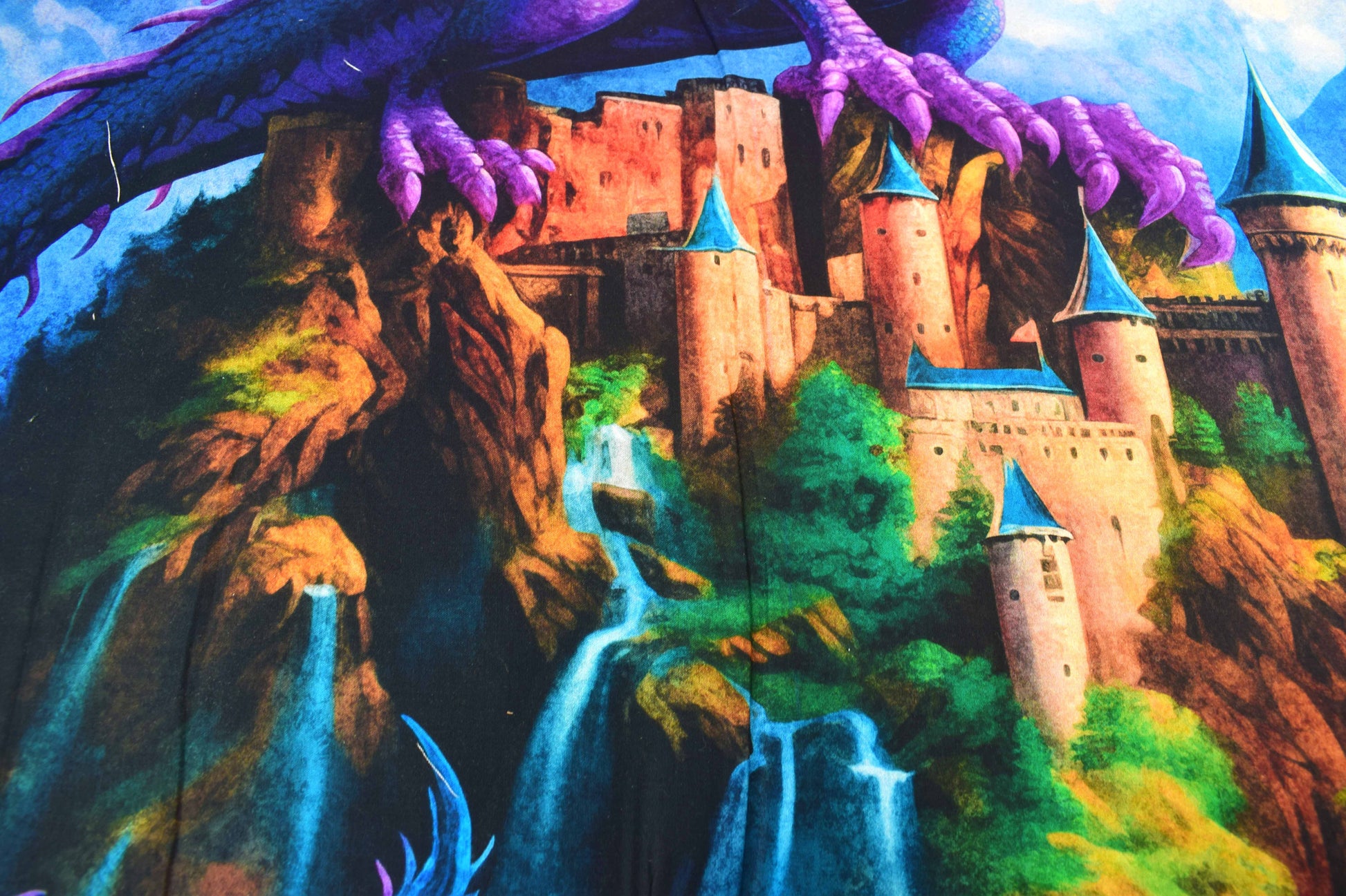 Bring fantasy to life with this striking cotton quilting panel featuring a majestic dragon perched above a castle in a dramatic mountain landscape. With vivid purples, fiery oranges, and rich blues, the design is full of colour and detail, making it an impressive focal point for any sewing project.