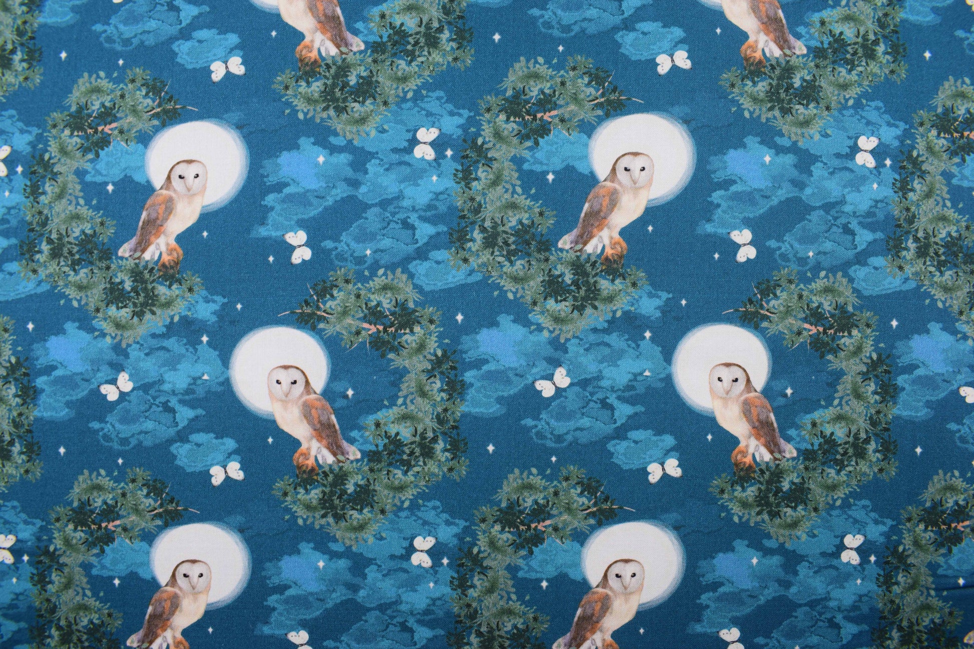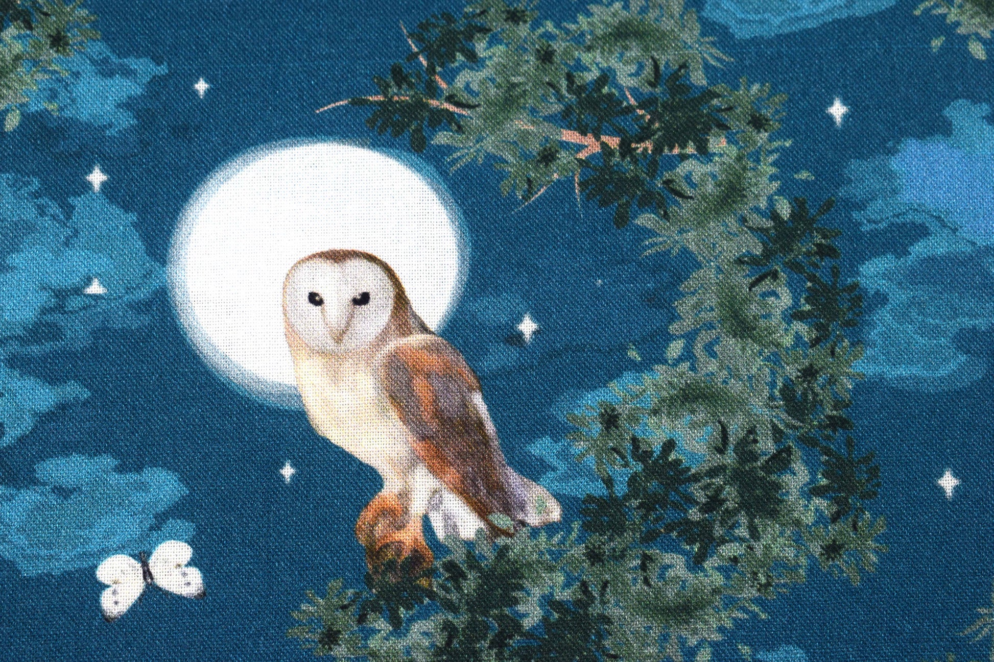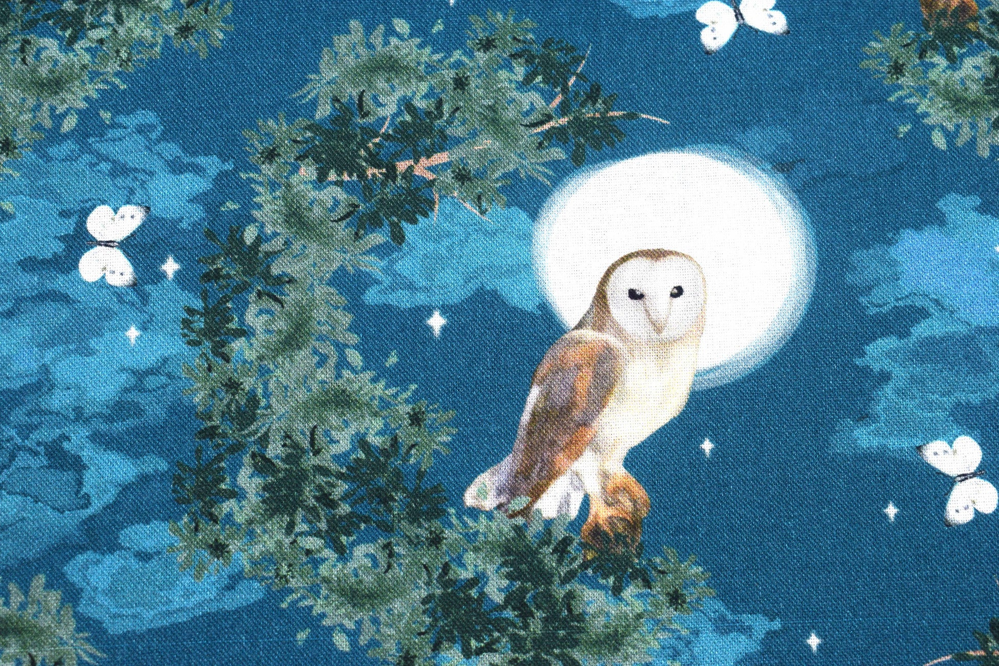 Mystical Barn Owl and Full Moon Quilting Cotton part of the Woodland Wanders range designed by Sarah Payne for the Craft Cotton Company