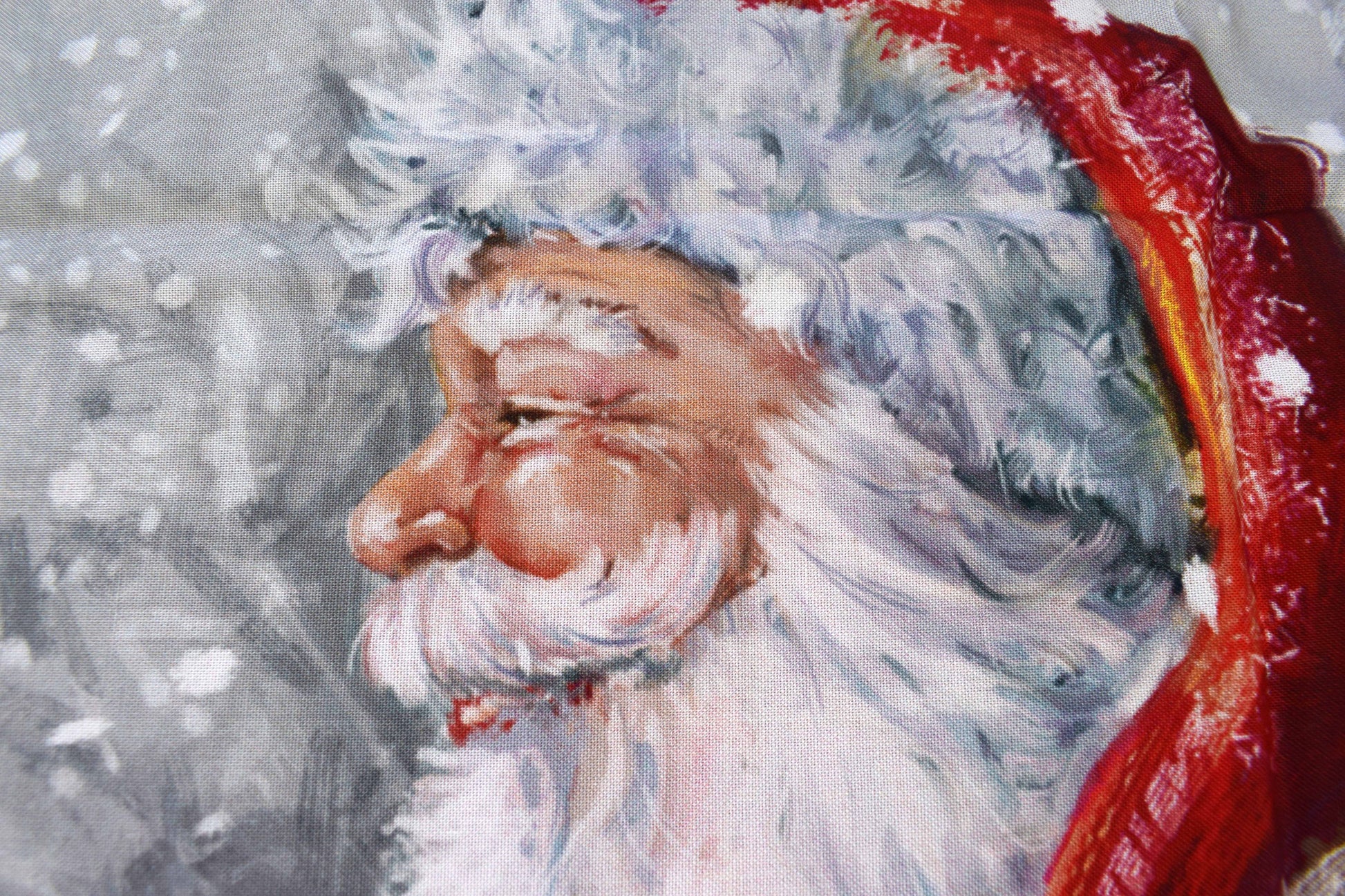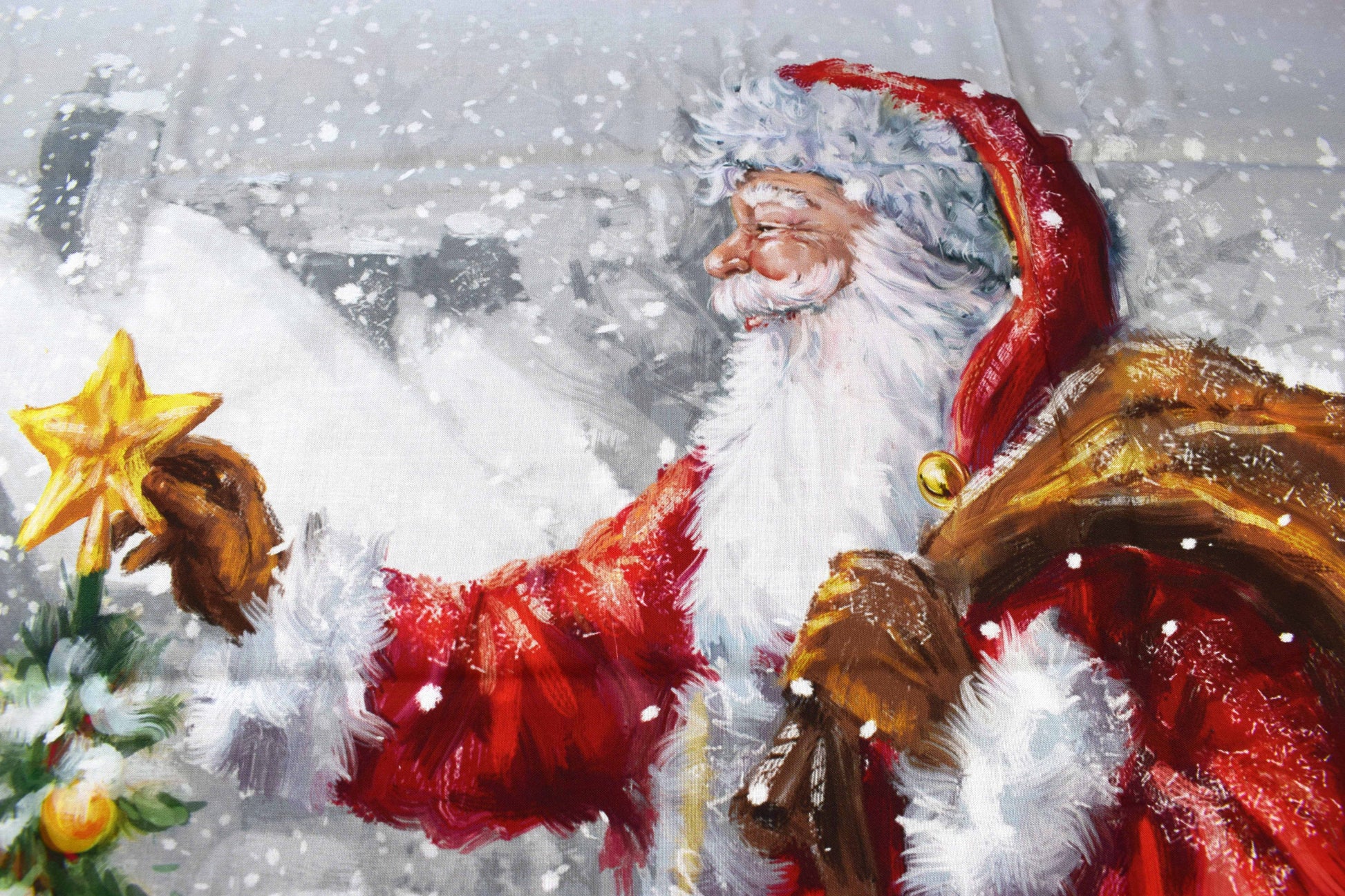 Capture the spirit of Christmas with this stunning fabric panel featuring a beautiful, classic depiction of Santa Claus placing the golden star on top of a snow-covered Christmas tree.