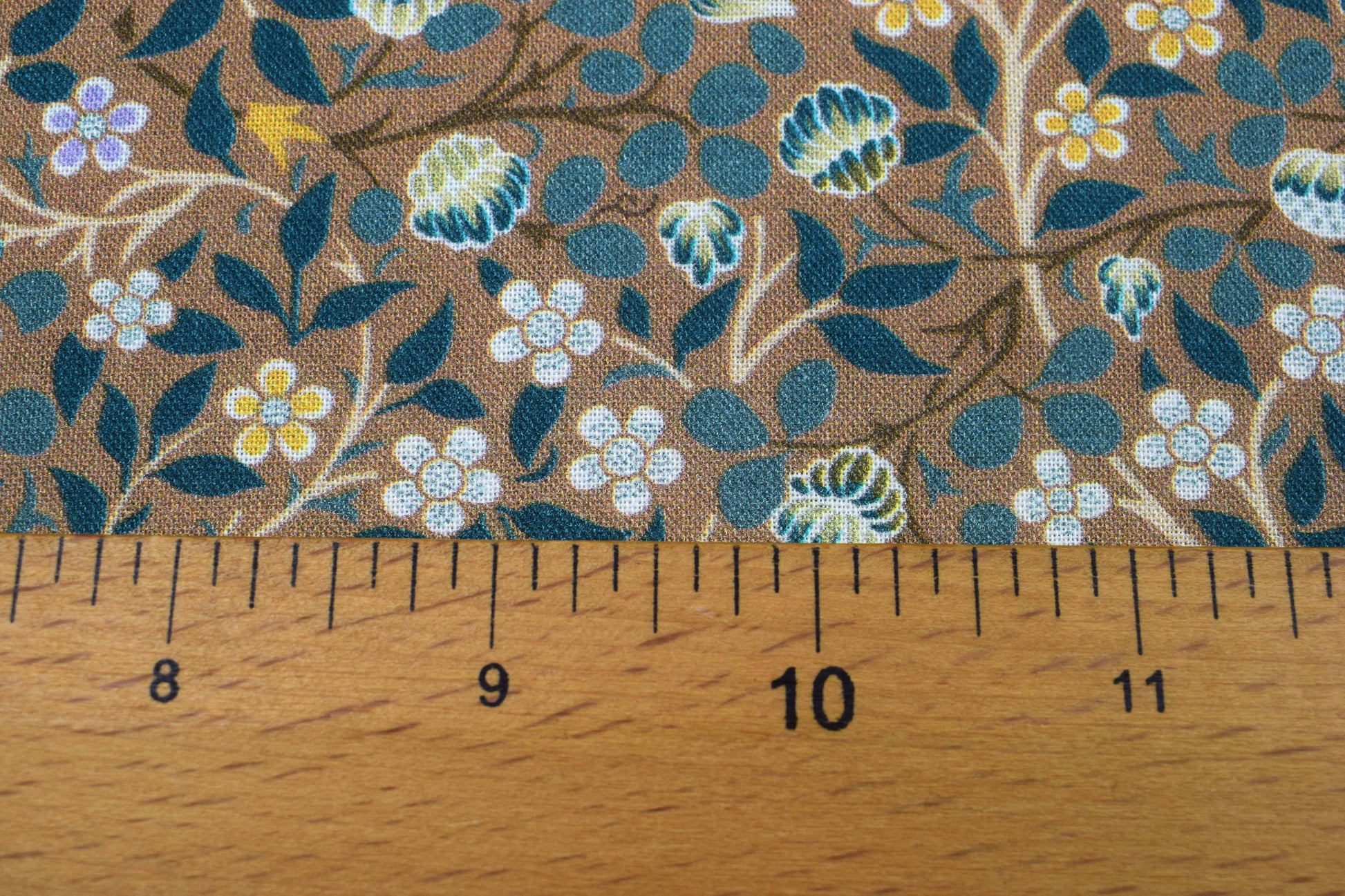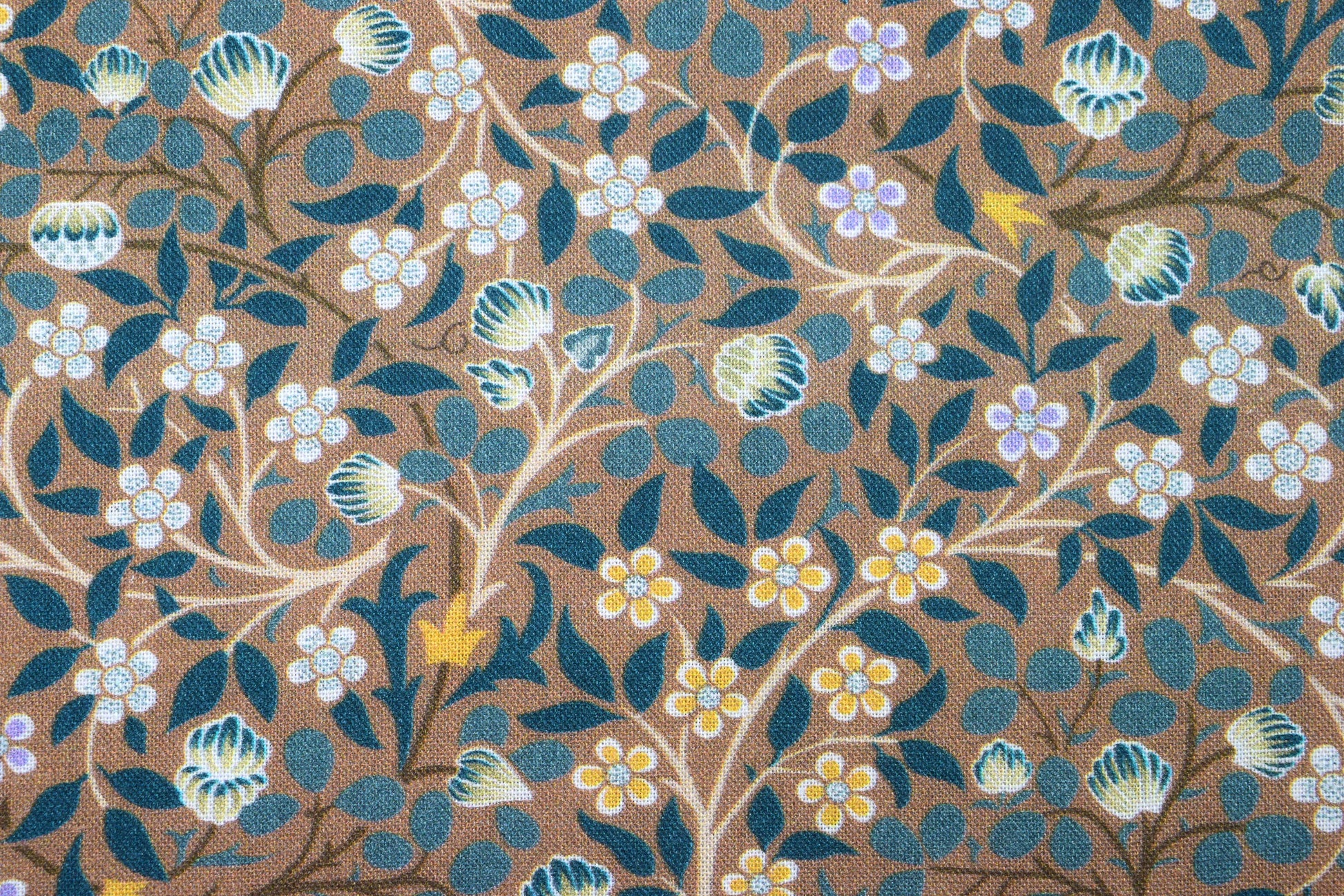 Transport your quilting and sewing projects to the elegant era of the Arts and Crafts movement with this exquisite fabric. Inspired by the iconic William Morris "Clover" mural, this design features a dense, trailing pattern of stylized leaves and multiple small floral motifs set against a warm, grounding brown background.